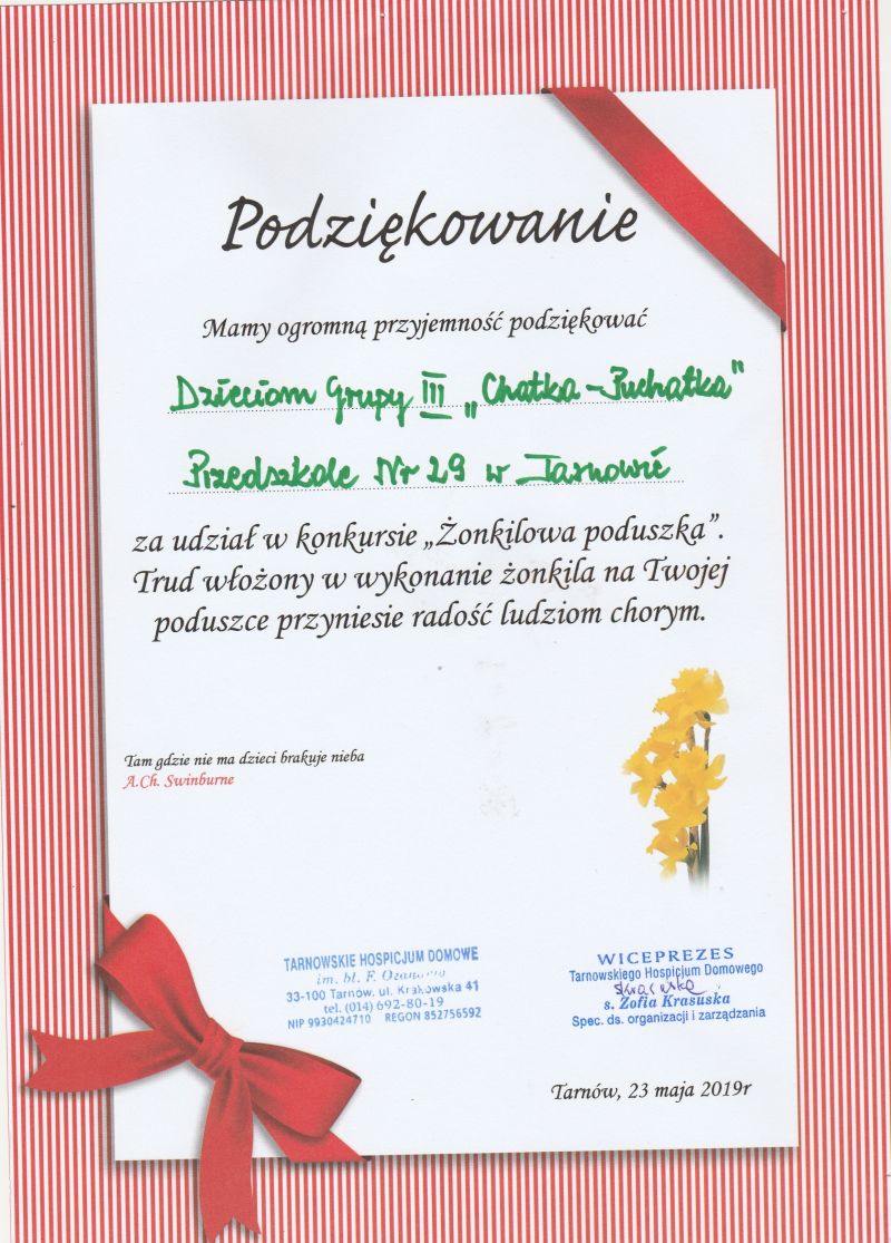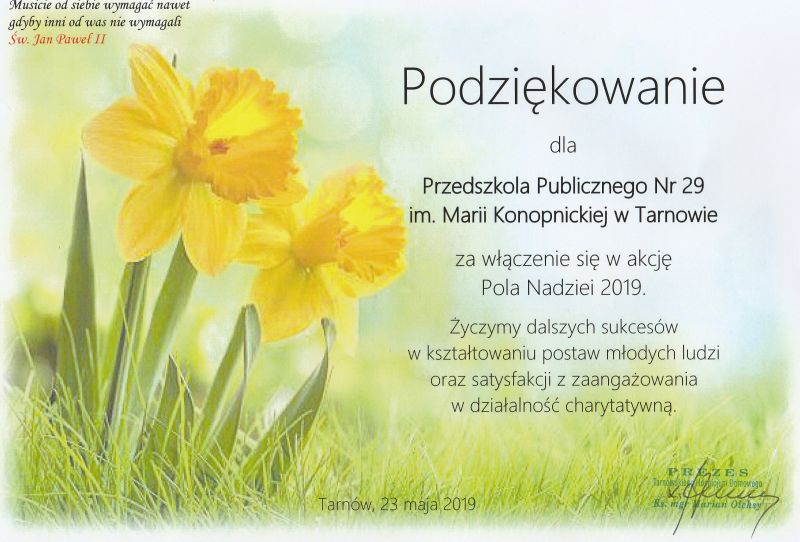 23.05. br. troje przedstawicieli z naszego Przedszkola wzięło udział w uroczystym zakończeniu tegorocznej akcji POLA NADZIEI, która odbyła się przy Kościele Księży Misjonarzy. W uroczystości uczestniczyli przedstawiciele instytucji oświatowych zaangażowani w zbiórkę datków na rzecz ludzi chorych,znajdujących się pod opieką najbliższych w domach rodzinnych. Nasze Przedszkole oraz przedszkolaki z III grupy za swój drobny wkład i wzięcie udziału w konkursie plastycznym na żonkilową poduszkę otrzymały dyplomy, puzzle, drobne upominki oraz szczere podziękowania za rozbudzanie w najmłodszych potrzeby niesienia pomocy potrzebującym.