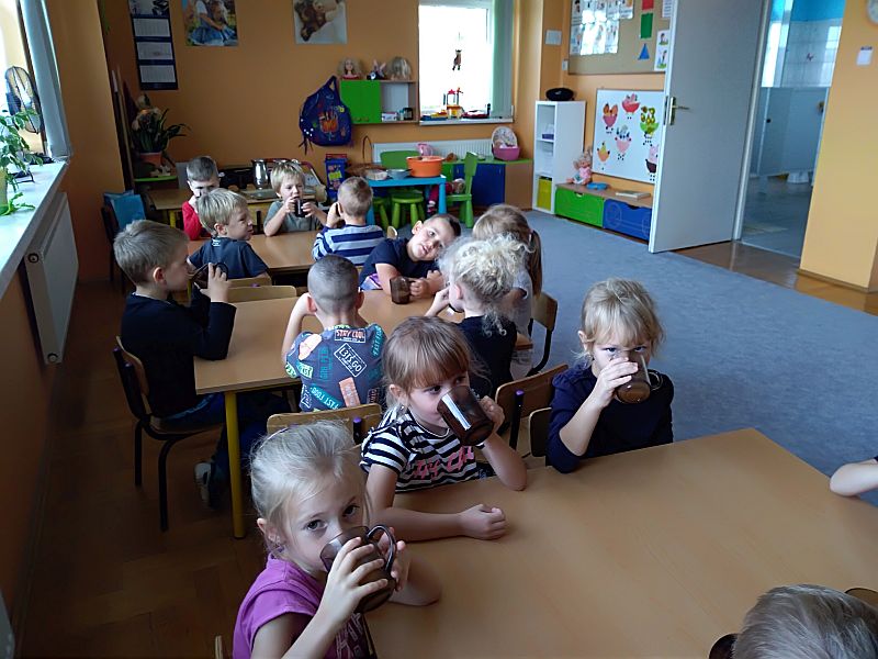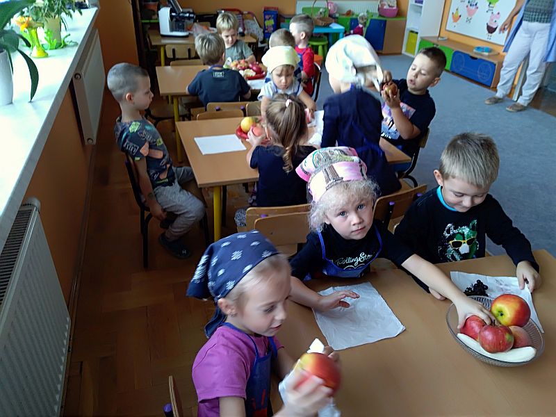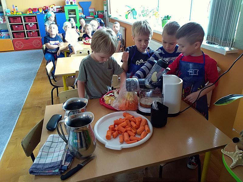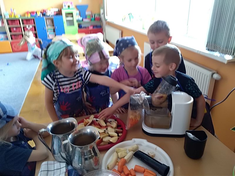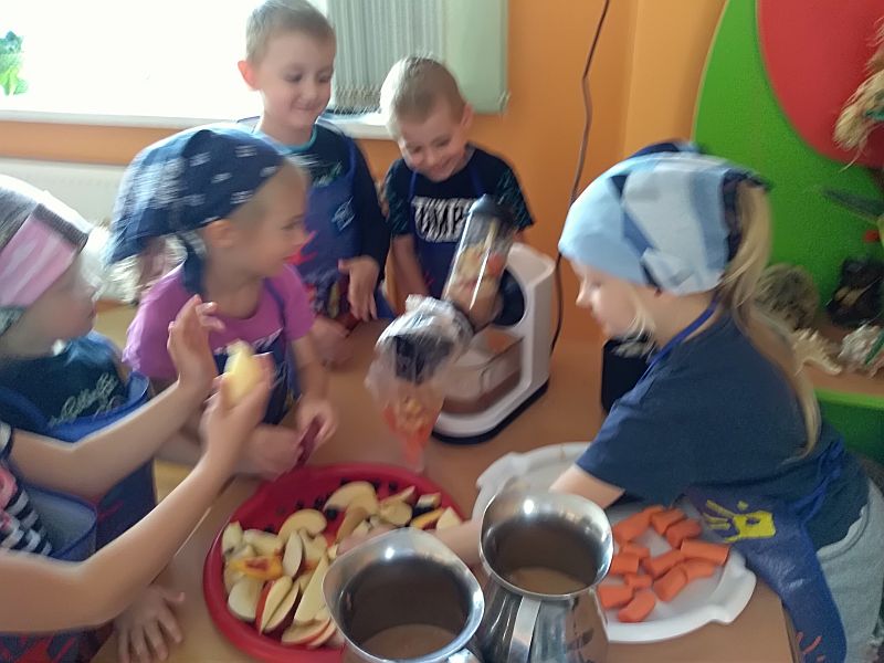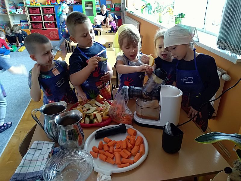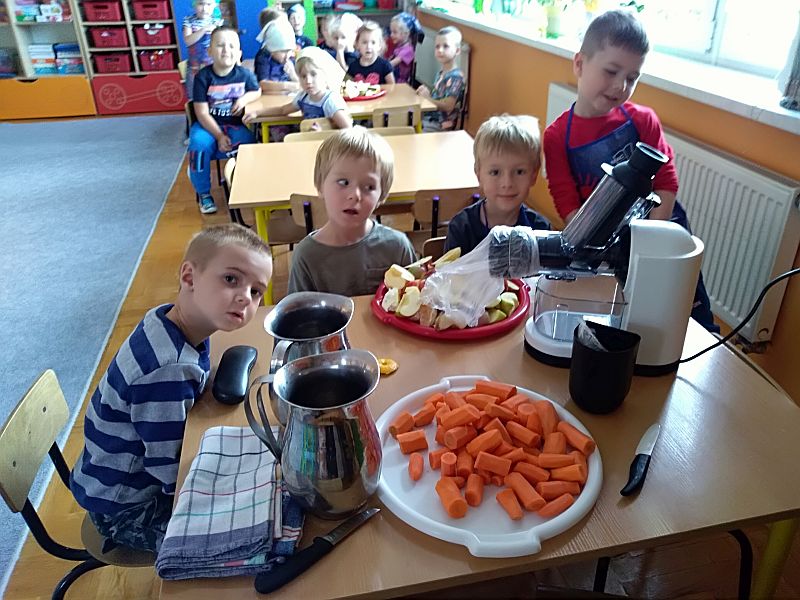 W miesiącu wrześniu dzieci z ODDZIAŁU IV „SŁONECZKA” uczyły się zdrowo odżywiać. W tym celu 26.09 .2019 roku podczas zorganizowanego zajęcia samodzielnie wykonały świeży sok owocowo- warzywny za pomocą wyciskarki do soków. Dzieci zostały uświadomione jak ważne jest dla zdrowia picie naturalnych soków. Wiedzą , że owoce i warzywa są źródłem wielu witamin.