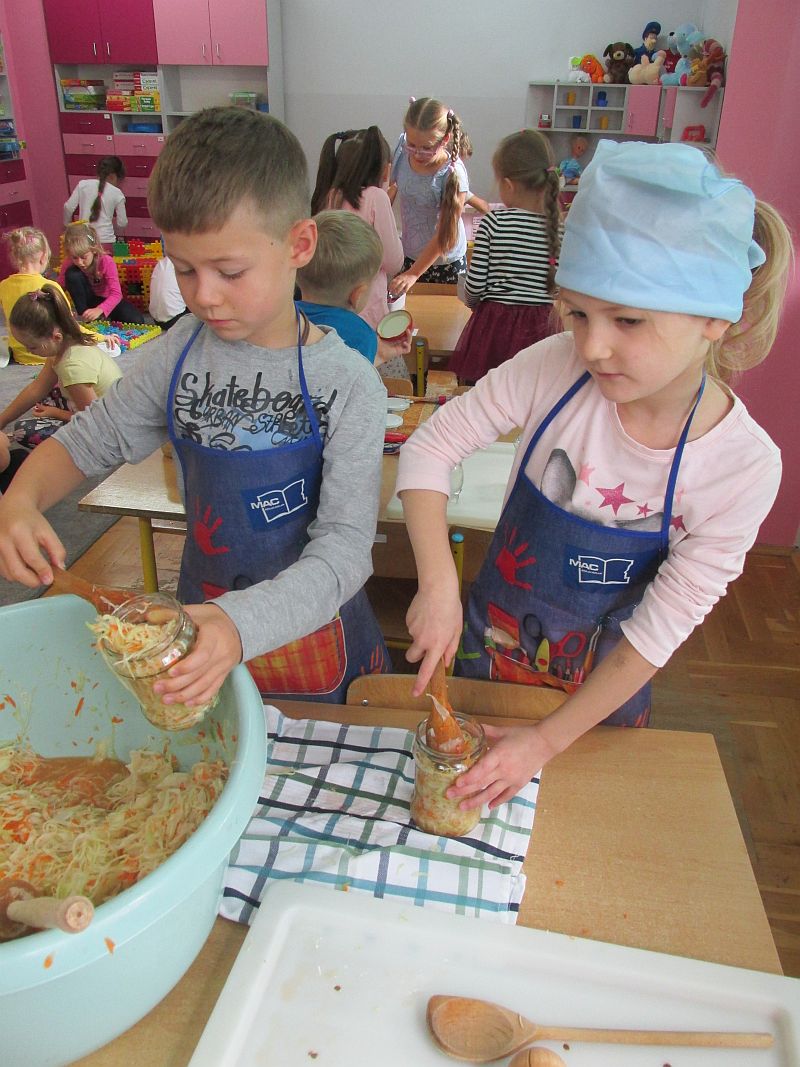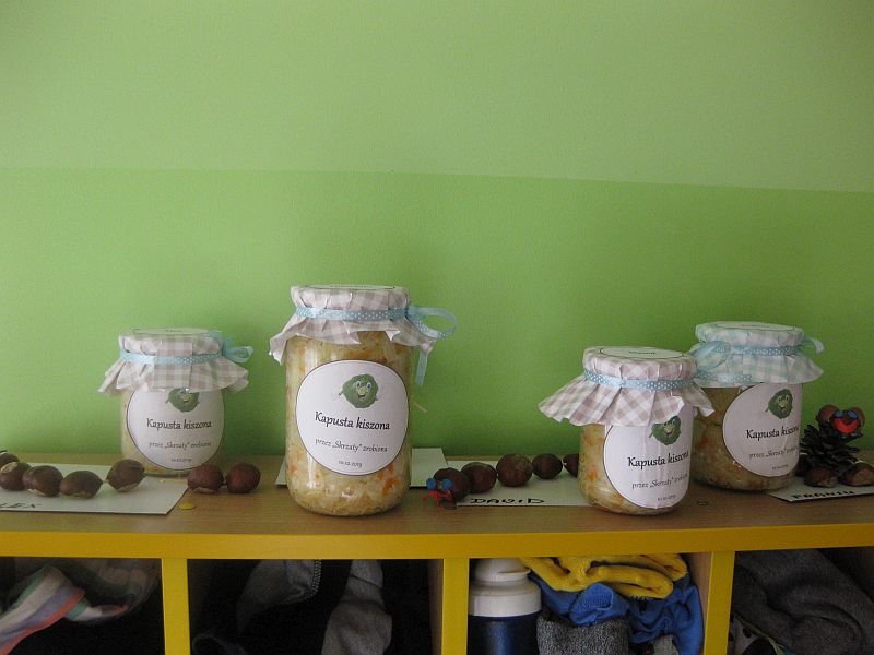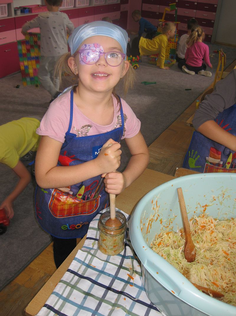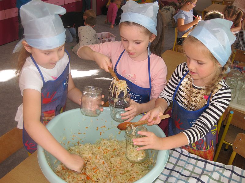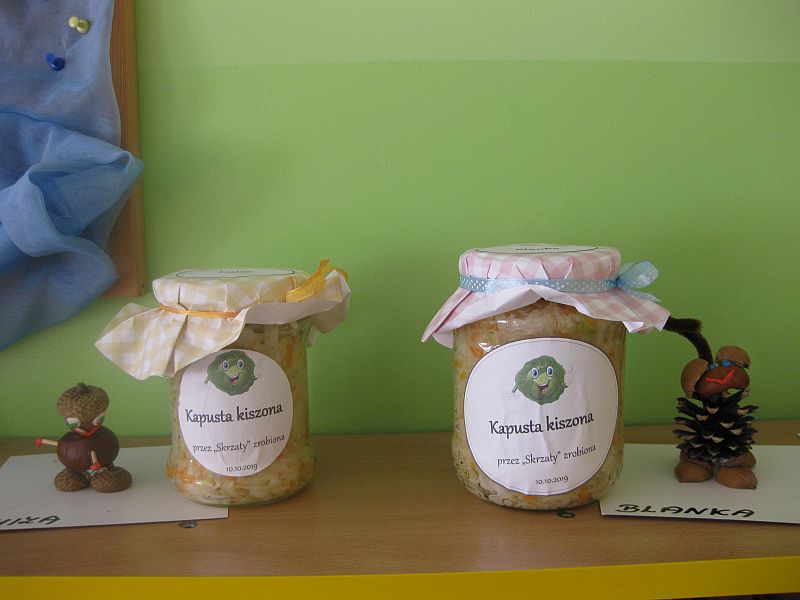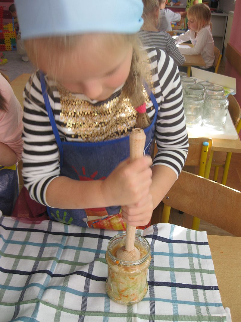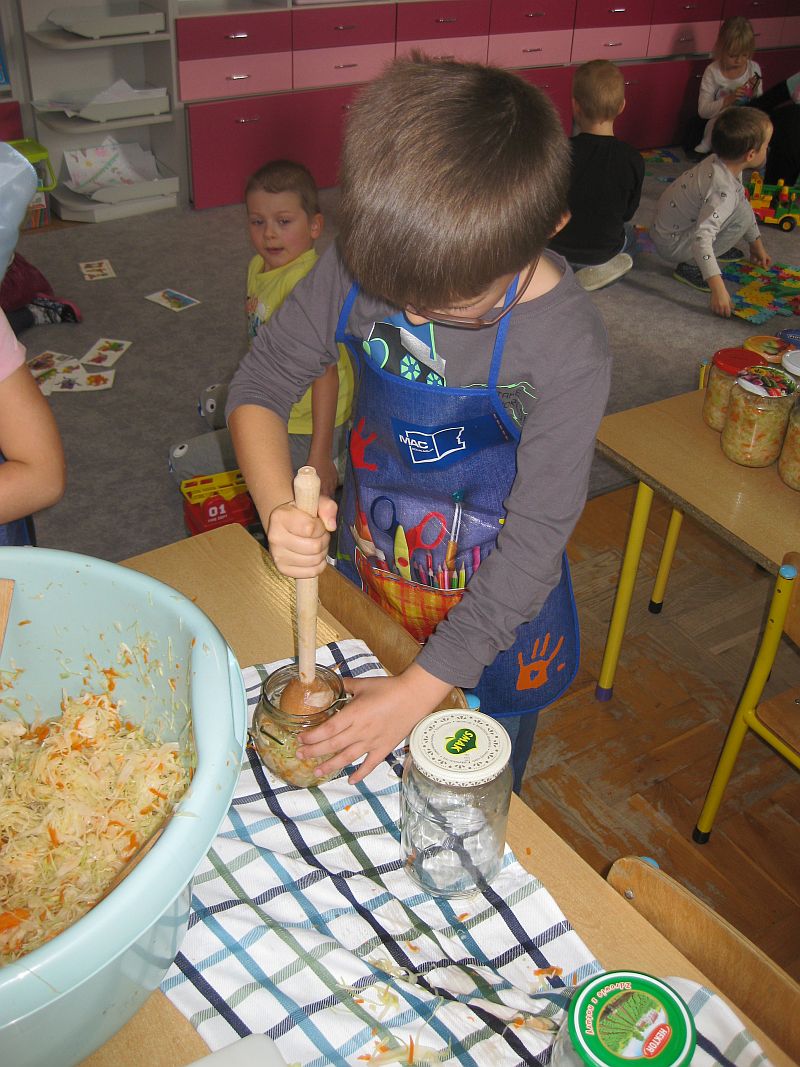 Miesiąc październik jest znakomity do kiszenia kapusty na zimę.Dzieci z Grupy V z ochotą zabrały się do robienia zapasów.Poszatkowaną i nasoloną kapustę z dodatkiem startej marchewki nakładały do przygotowanych wcześniej słoików.Przygotowane przetwory oznaczyły i ozdobiły.W spiżarniach domowych kapusta będzie się kisiła aż do grudnia.Ukiszona kapusta zawiera dużo witaminki C.