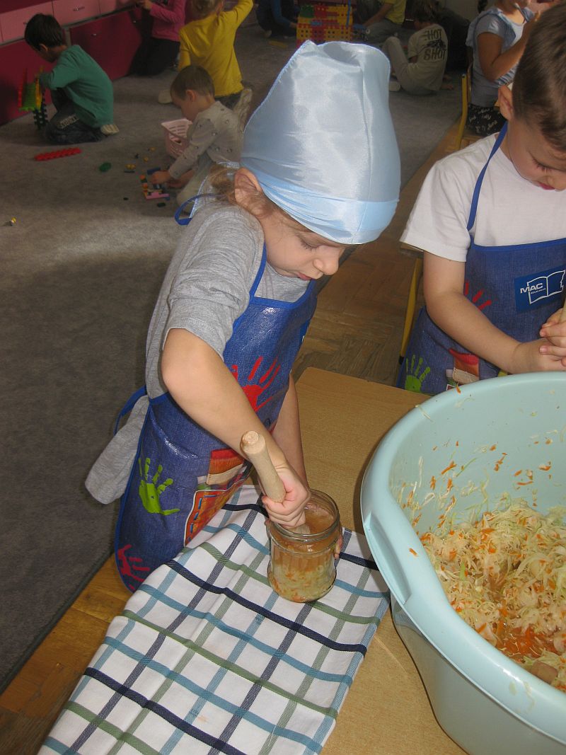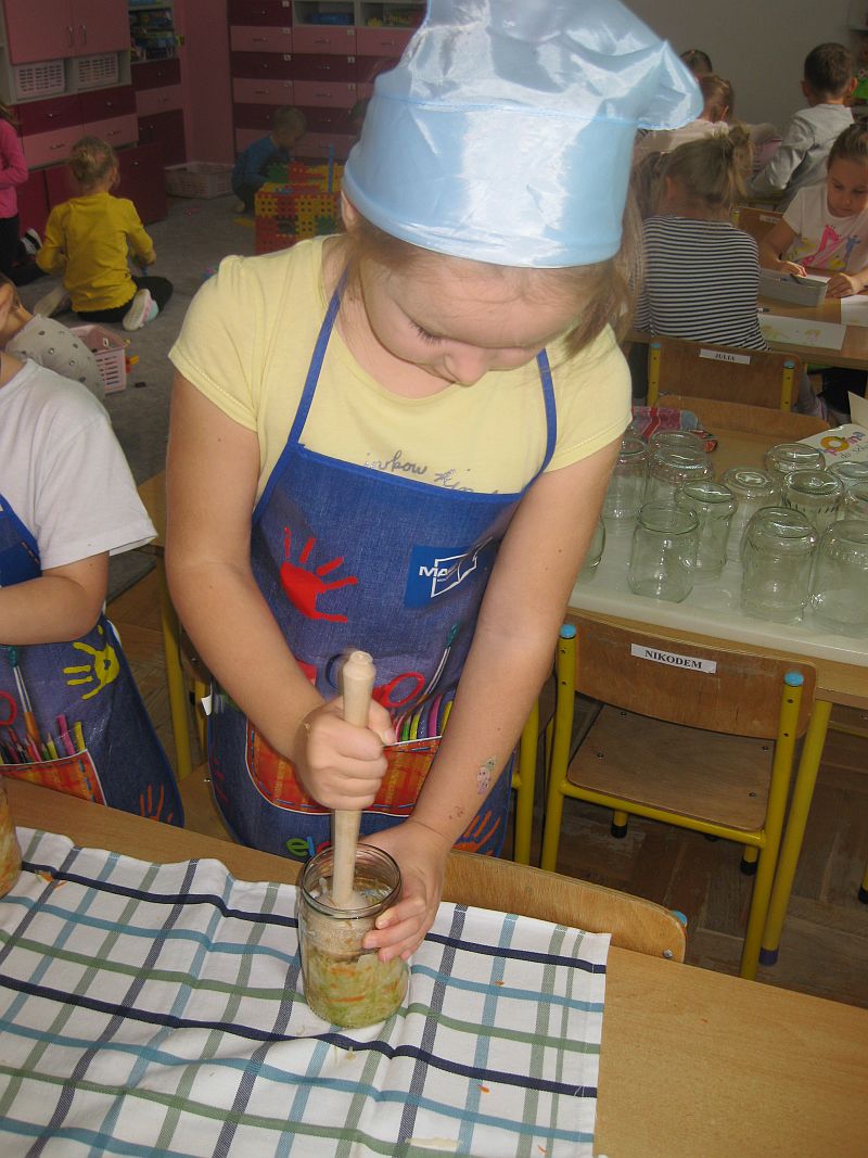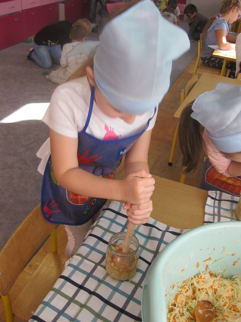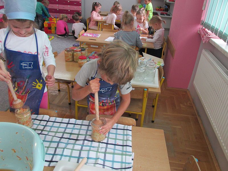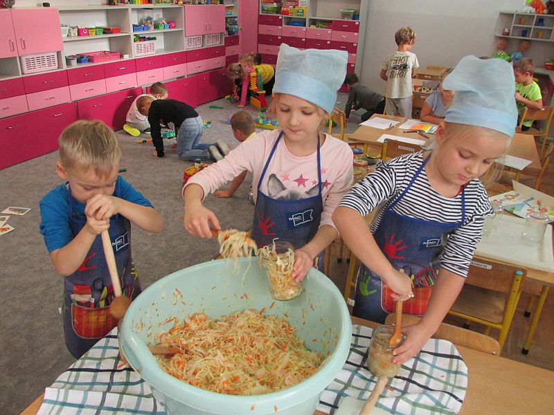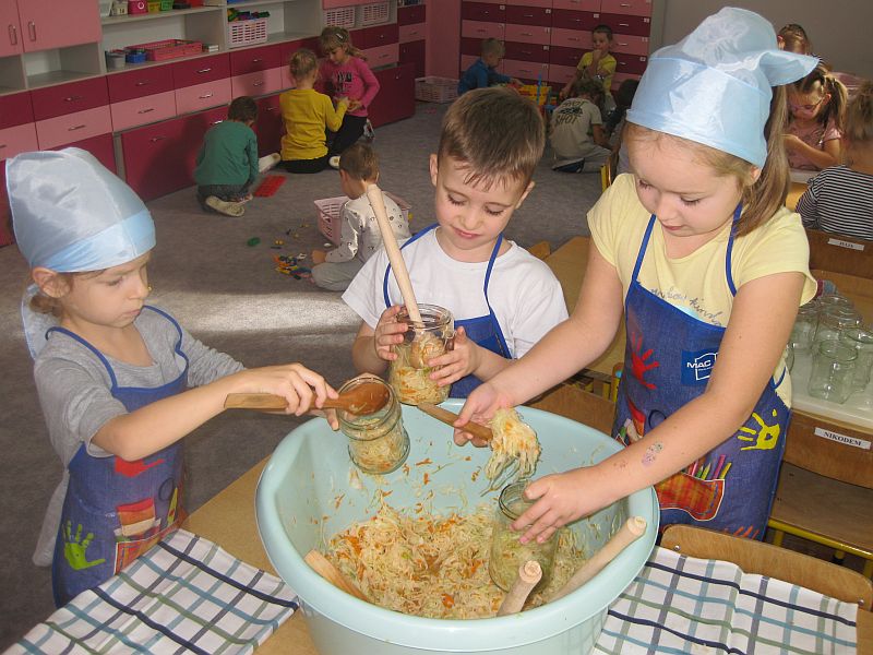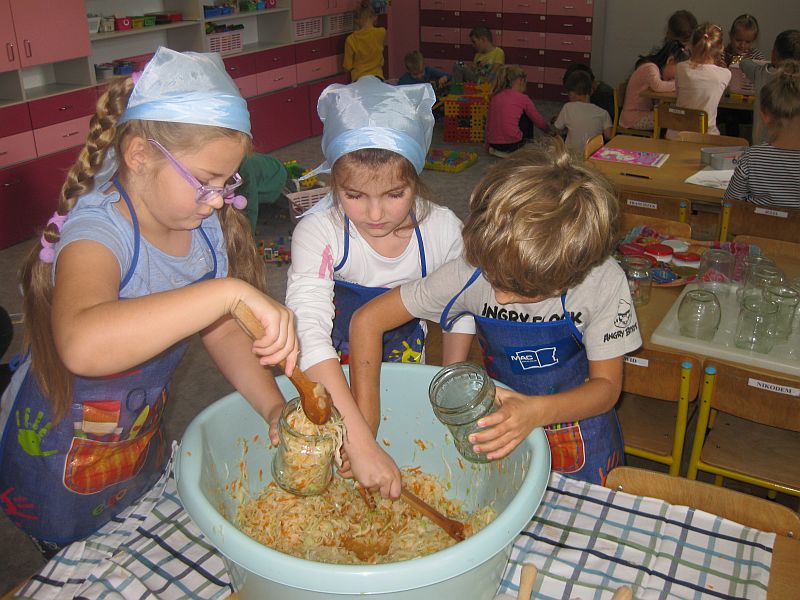 Miesiąc październik jest znakomity do kiszenia kapusty na zimę.Dzieci z Grupy V z ochotą zabrały się do robienia zapasów.Poszatkowaną i nasoloną kapustę z dodatkiem startej marchewki nakładały do przygotowanych wcześniej słoików.Przygotowane przetwory oznaczyły i ozdobiły.W spiżarniach domowych kapusta będzie się kisiła aż do grudnia.Ukiszona kapusta zawiera dużo witaminki C.
