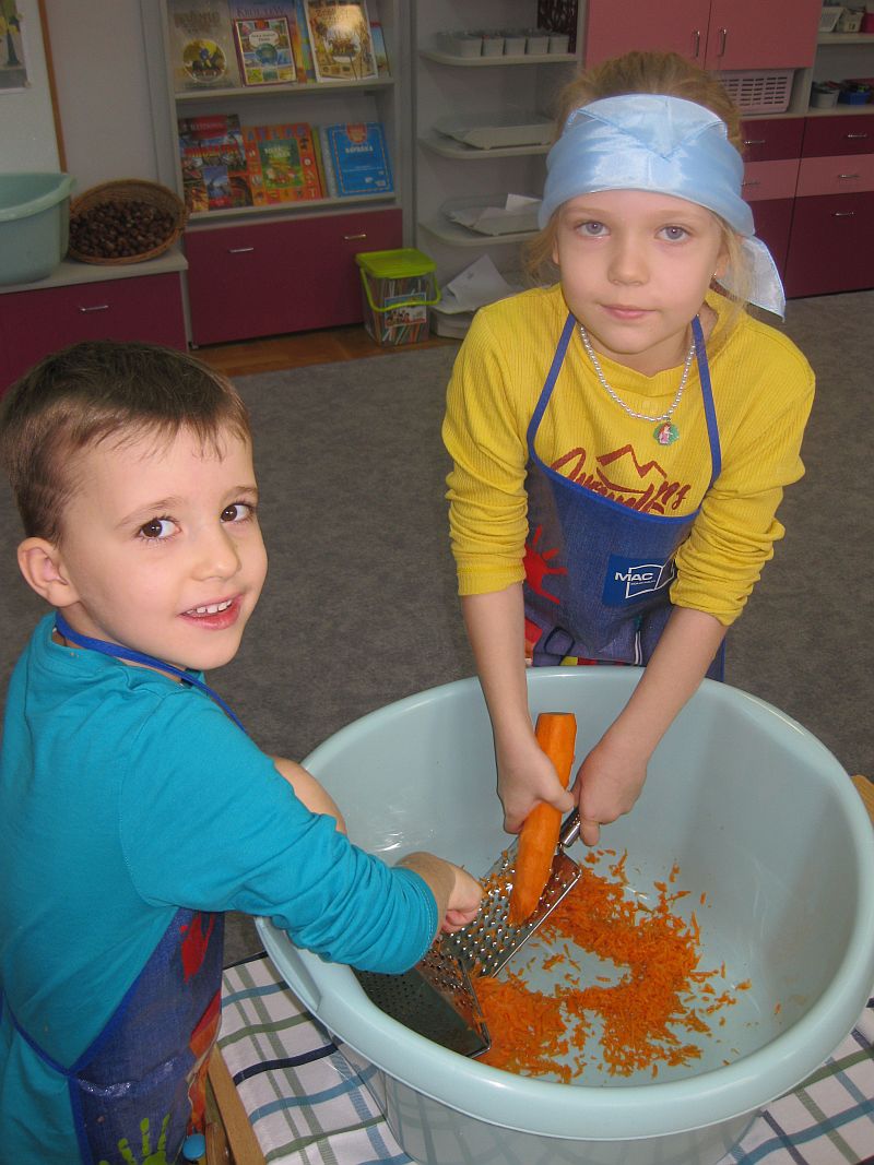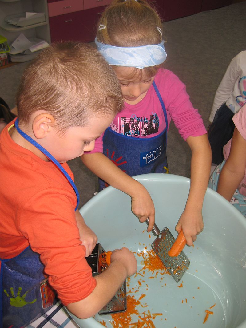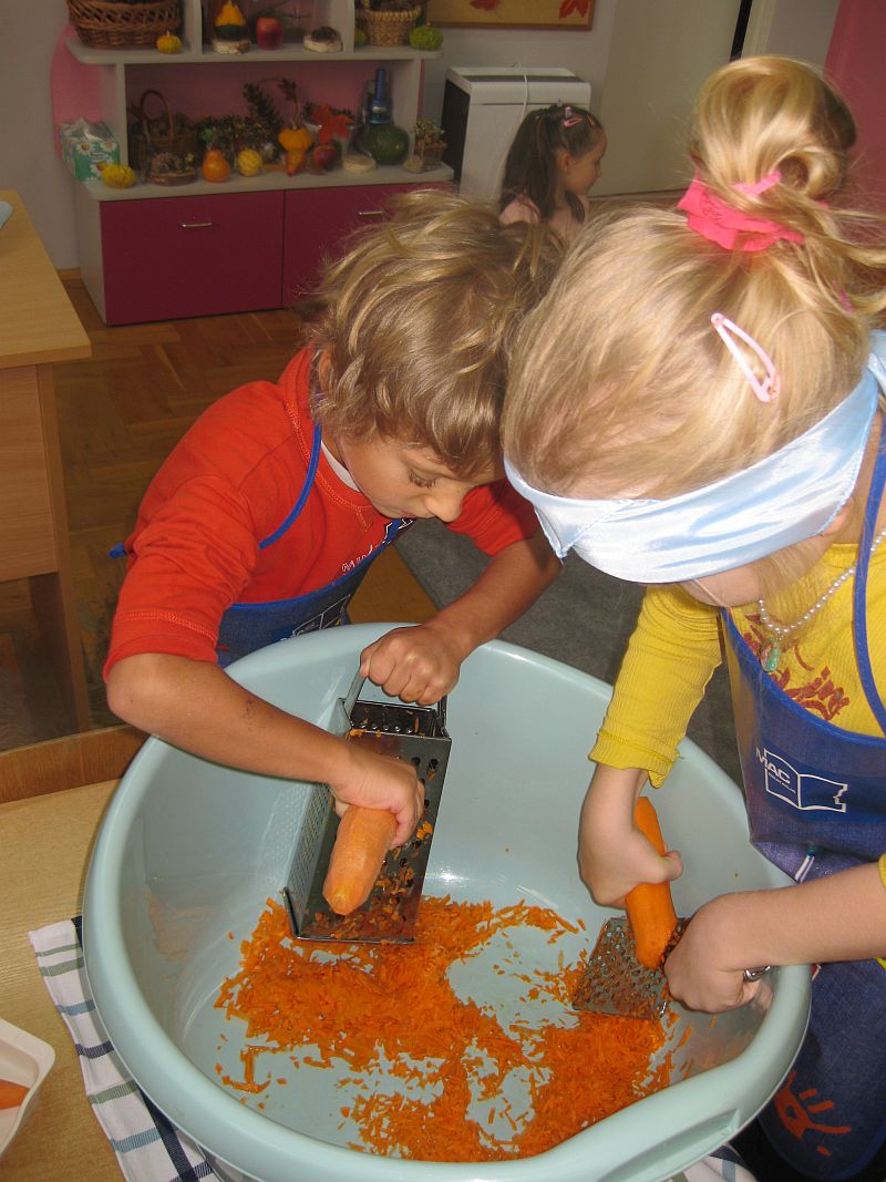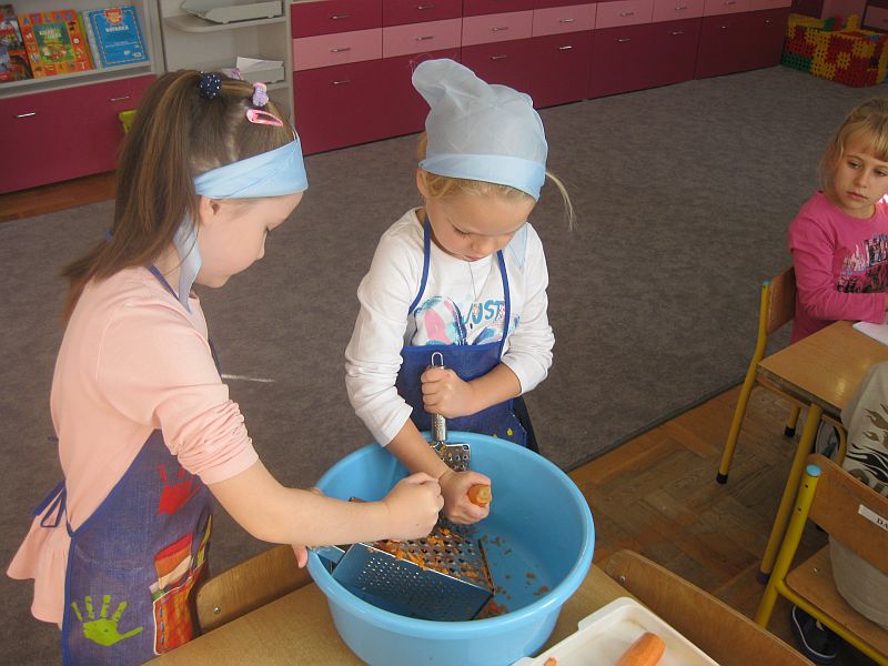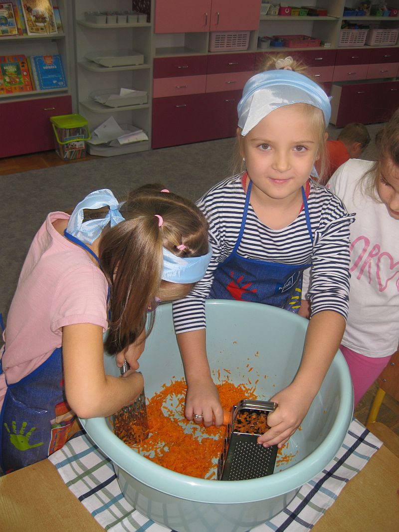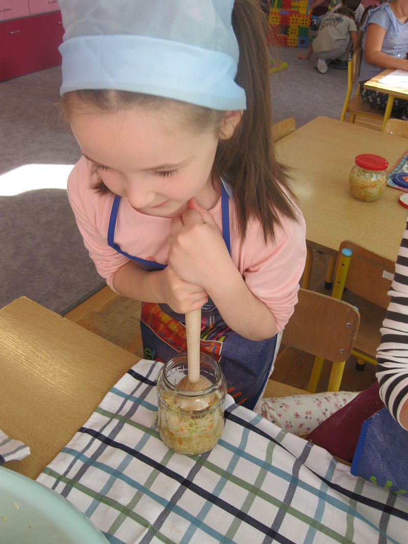 Miesiąc październik jest znakomity do kiszenia kapusty na zimę.Dzieci z Grupy V z ochotą zabrały się do robienia zapasów.Poszatkowaną i nasoloną kapustę z dodatkiem startej marchewki nakładały do przygotowanych wcześniej słoików.Przygotowane przetwory oznaczyły i ozdobiły.W spiżarniach domowych kapusta będzie się kisiła aż do grudnia.Ukiszona kapusta zawiera dużo witaminki C.