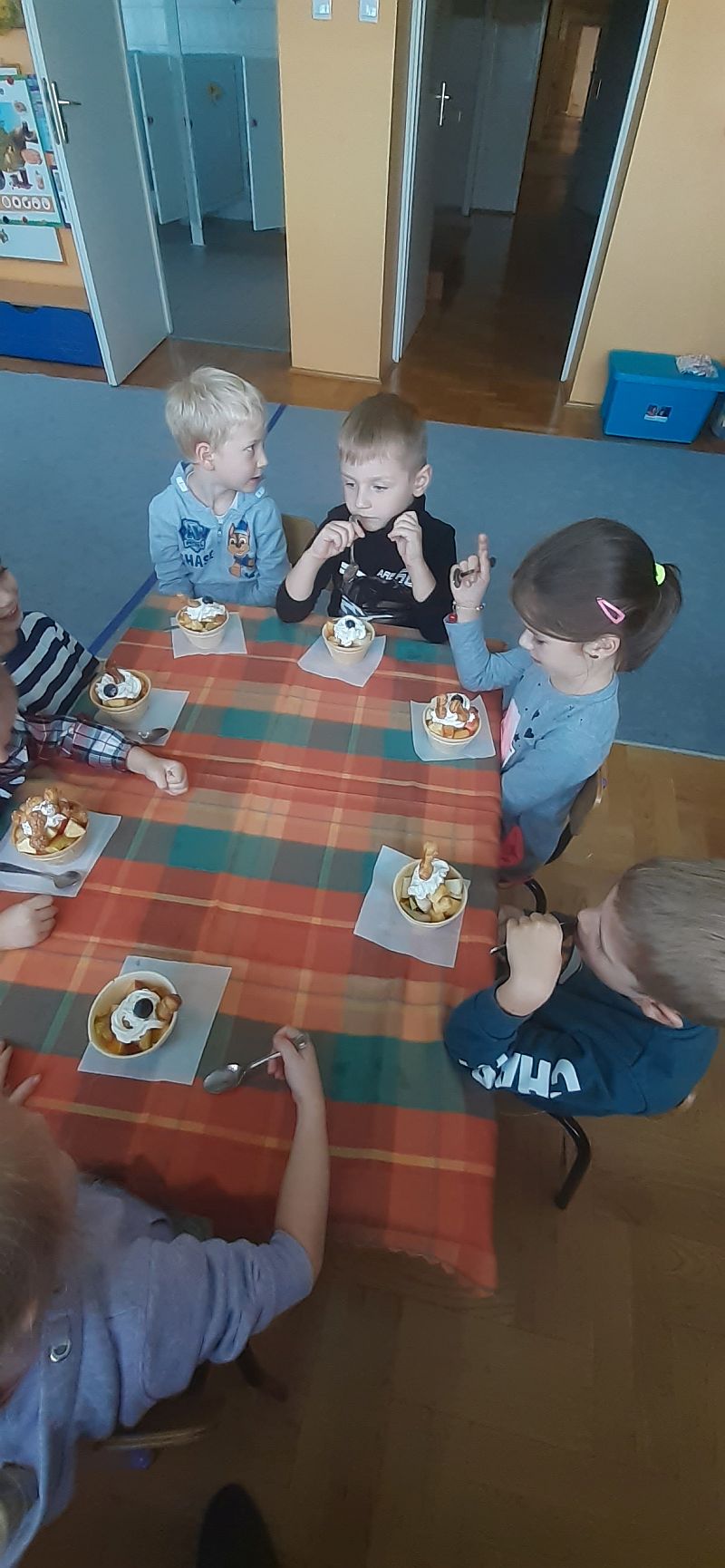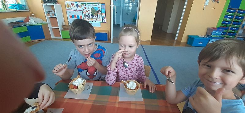 Przygotowujemy dowolną ilość owoców,które myjemy i obieramy. Większe owoce kroimy na małe kawałki. Do waflowych miseczek wsypujemy do połowy wybrane cząstki owoców.Całość dekorujemy niewielką ilością bitej śmietany, na którą nakładamy kulki winogron lub maliny i kilka pałeczek ptysiowych.