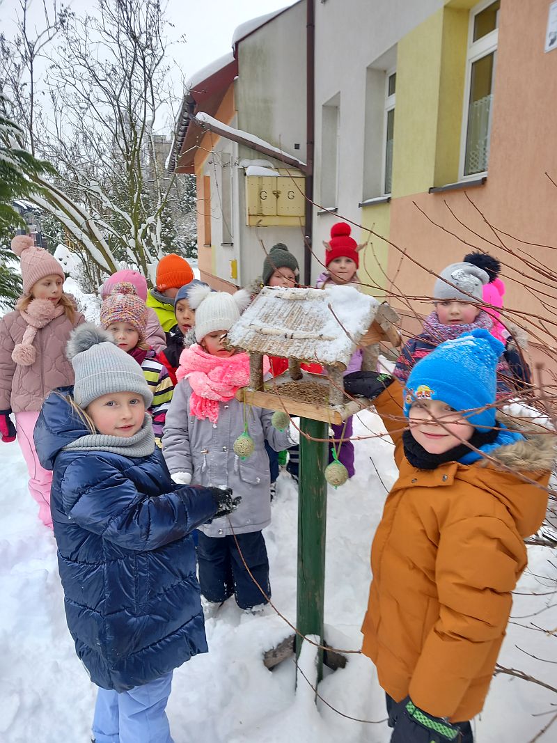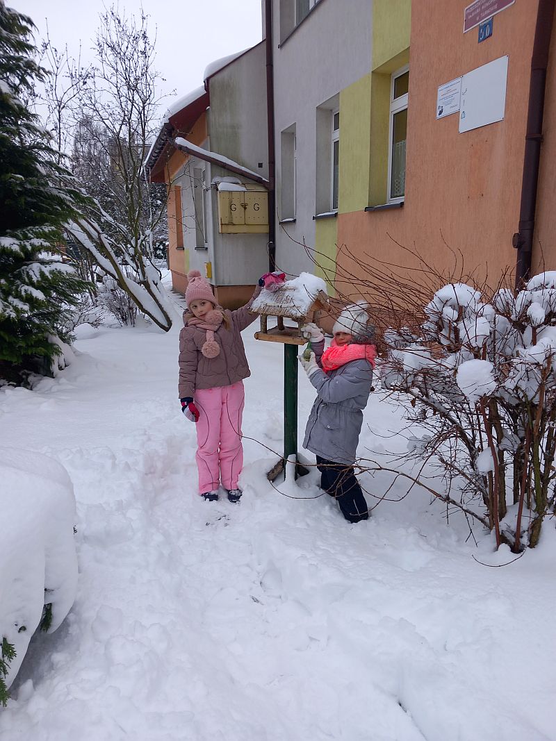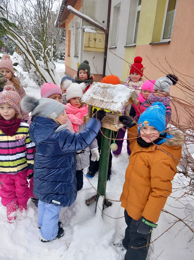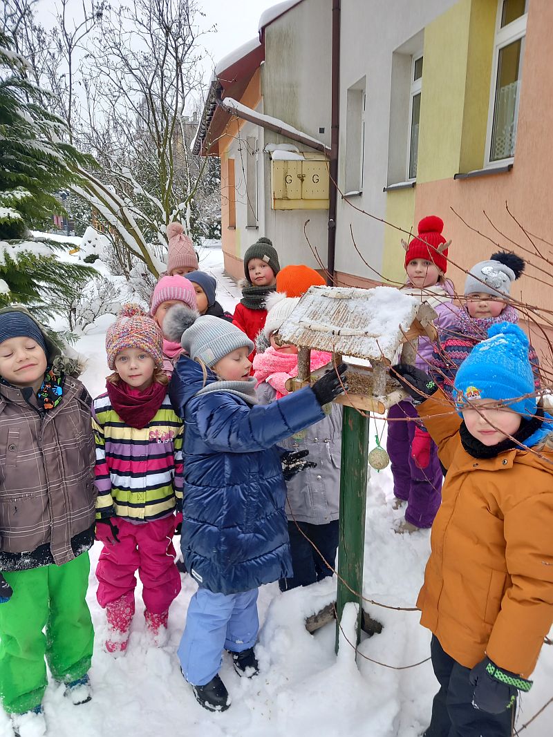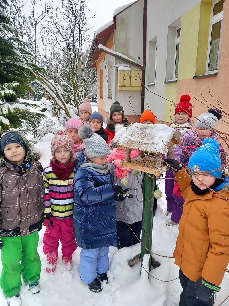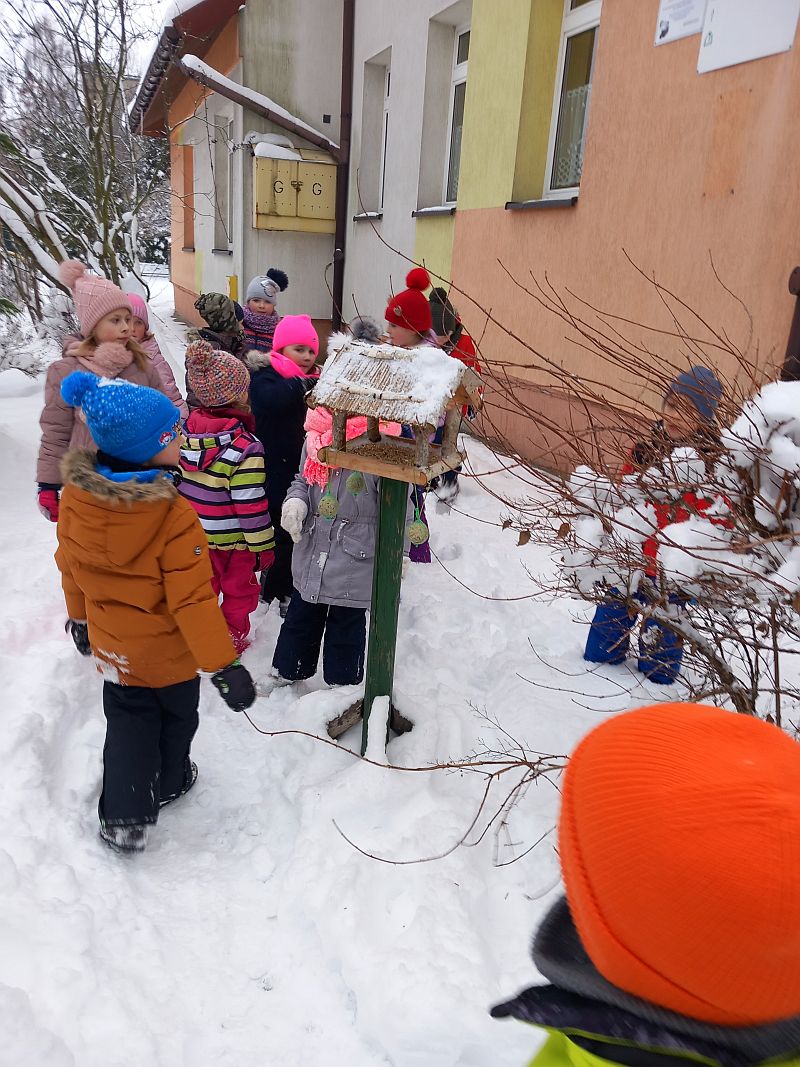 Zima to trudny czas dla ptaków,szczególnie w zdobywaniu pokarmu.Pamiętając o tym przedszkolaki z grupy VI dostarczyły do karmnika ptasie smakołyki.