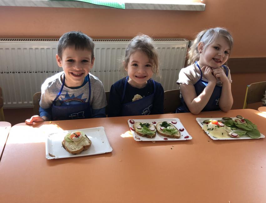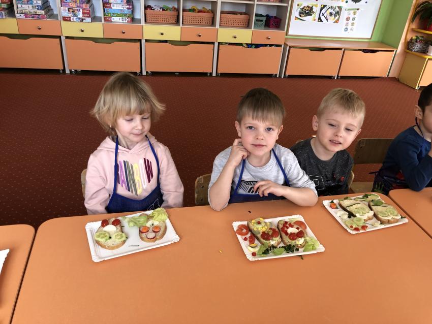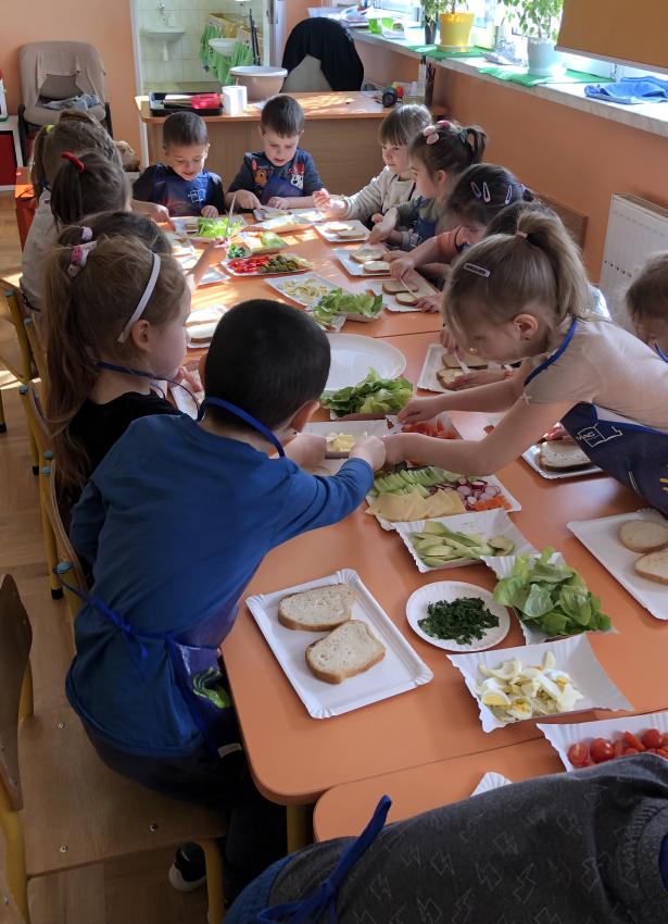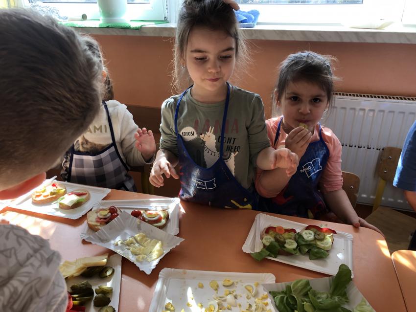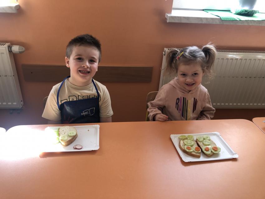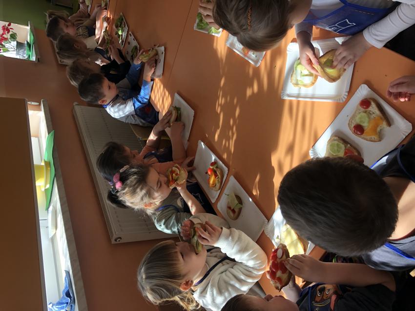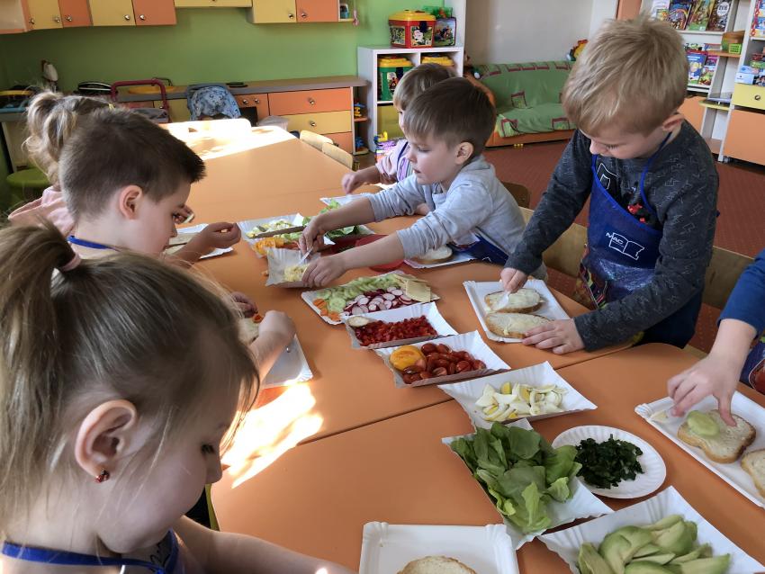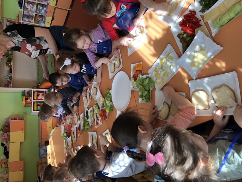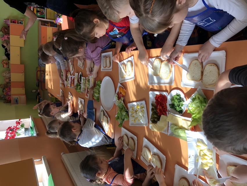 Dzieci z naszego przedszkola przywołują wiosnę! Zajęcia kulinarne na przedwiośniu, to sama przyjemność! W sali -Chatka Puchatka- unosił się zapach szczypiorku i warzyw: sałaty, pomidorów, ogórków, pietruszki, awokado, papryki i rzodkiewki. Przedszkolaki z grupy III podjęły wielkie wyzwanie pod hasłem -Robimy wiosenne kolorowe kanapki. Świeże warzywa, sery, jajka, pieczywo to doskonałe produkty, które świetnie smakują i mają mnóstwo witamin. Dzieci samodzielnie smarowały, układały produkty tworząc na kanapkach fantazyjne wzory. Kanapeczki były bardzo kolorowe, smaczne a dzieci bardzo zadowolone. Pamiętajmy, że najlepiej smakują kanapki zrobione własnoręcznie:)