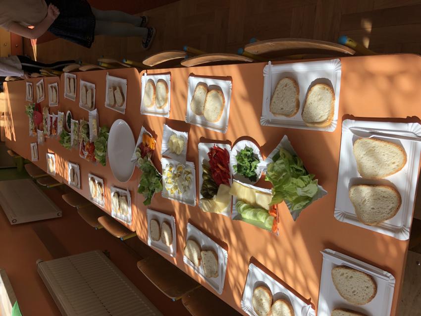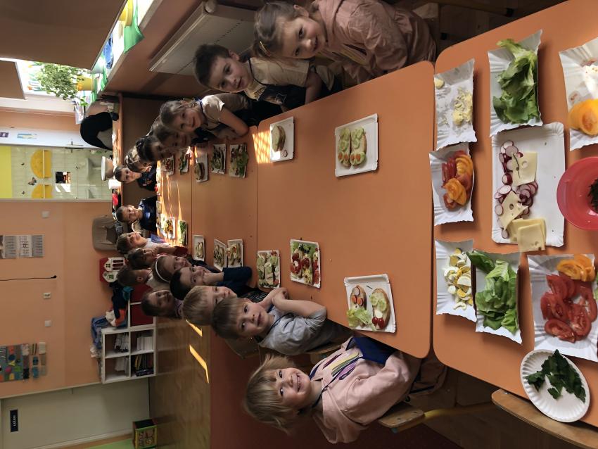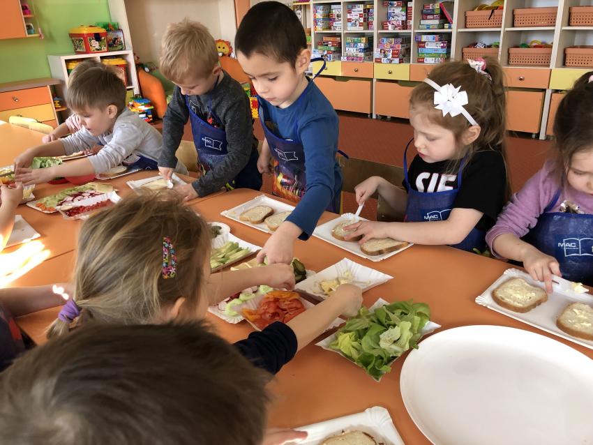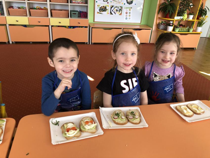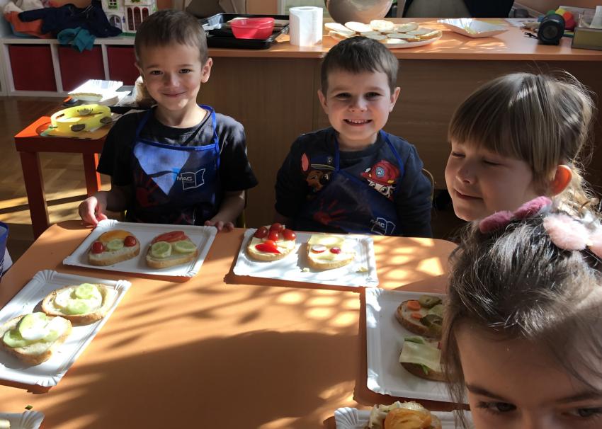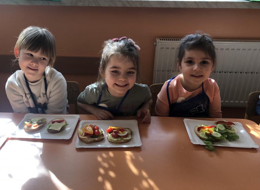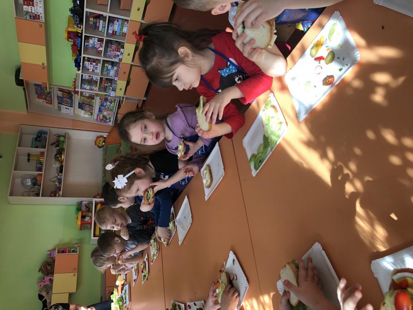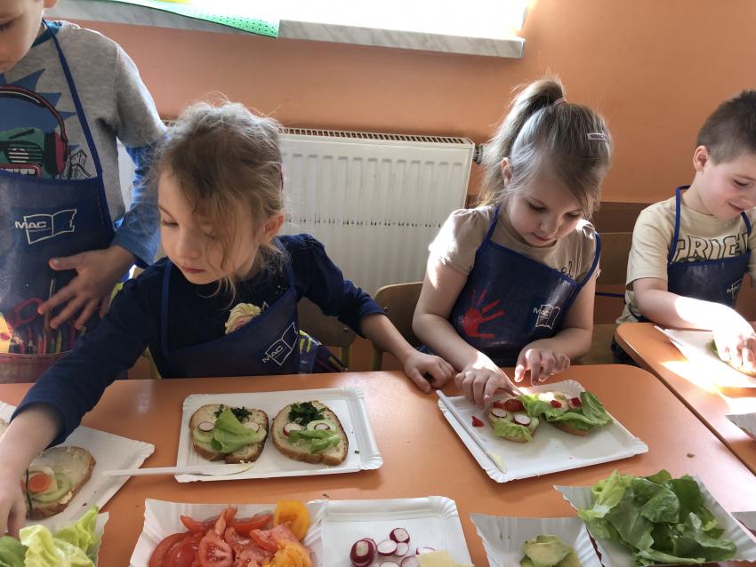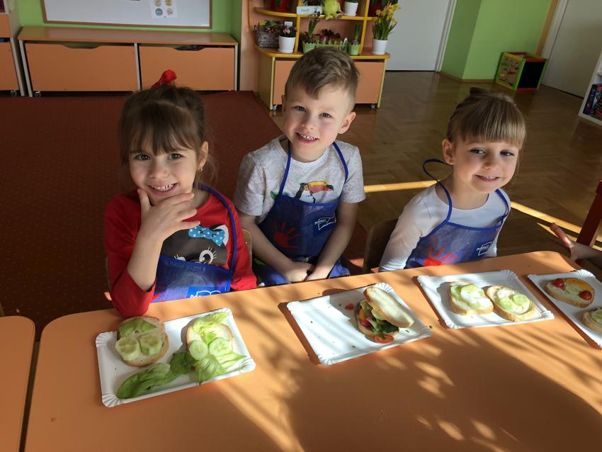 Dzieci z naszego przedszkola przywołują wiosnę! Zajęcia kulinarne na przedwiośniu, to sama przyjemność! W sali -Chatka Puchatka- unosił się zapach szczypiorku i warzyw: sałaty, pomidorów, ogórków, pietruszki, awokado, papryki i rzodkiewki. Przedszkolaki z grupy III podjęły wielkie wyzwanie pod hasłem -Robimy wiosenne kolorowe kanapki. Świeże warzywa, sery, jajka, pieczywo to doskonałe produkty, które świetnie smakują i mają mnóstwo witamin. Dzieci samodzielnie smarowały, układały produkty tworząc na kanapkach fantazyjne wzory. Kanapeczki były bardzo kolorowe, smaczne a dzieci bardzo zadowolone. Pamiętajmy, że najlepiej smakują kanapki zrobione własnoręcznie:)