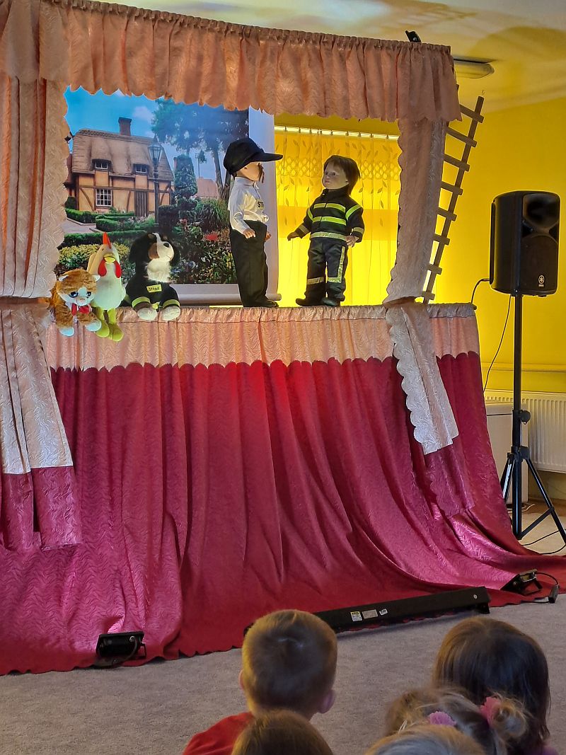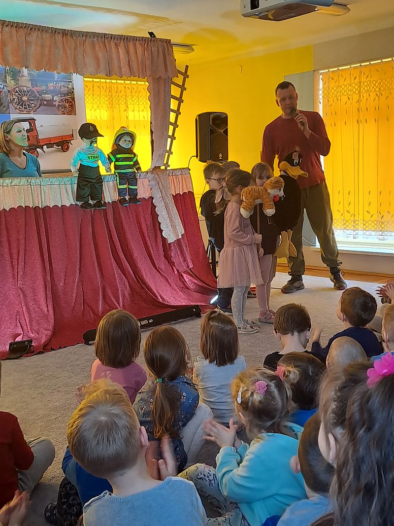 7 marca 2023 r. nasze przedszkole odwiedzili aktorzy Teatru Lalek Art. Cinema z Krakowa. Głównym bohaterem przedstawienia był chłopczyk Maciuś, który chciał zostać strażakiem. Razem z Maciusiem wystąpili jeszcze: piesek, kaczka, kotek oraz kogucik. Teatrzyk miał na celu uświadomienie dzieciom zagrożeń i niebezpieczeństw wynikających z ognia. Dzieci utrwaliły sobie również numery alarmowe. Przedstawienie bardzo się podobało o czym świadczyły głośne brawa na koniec występu.