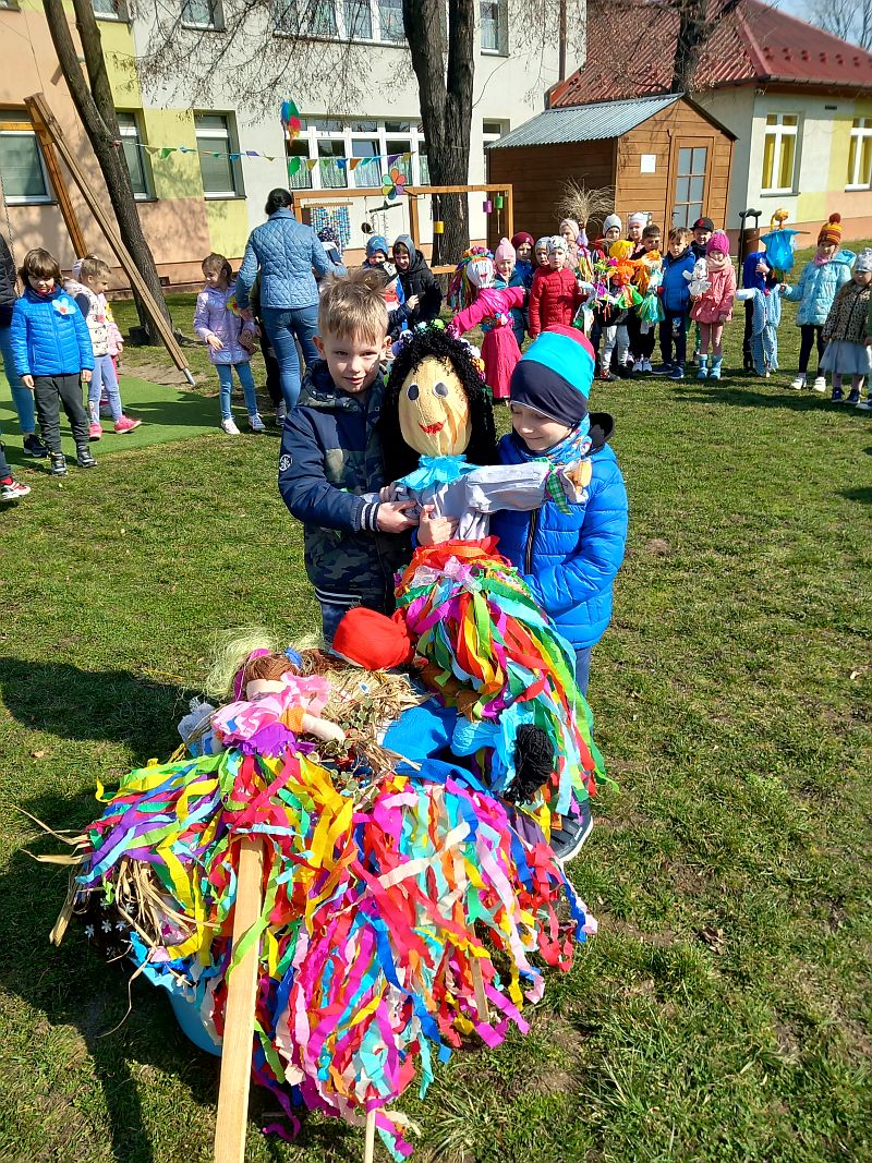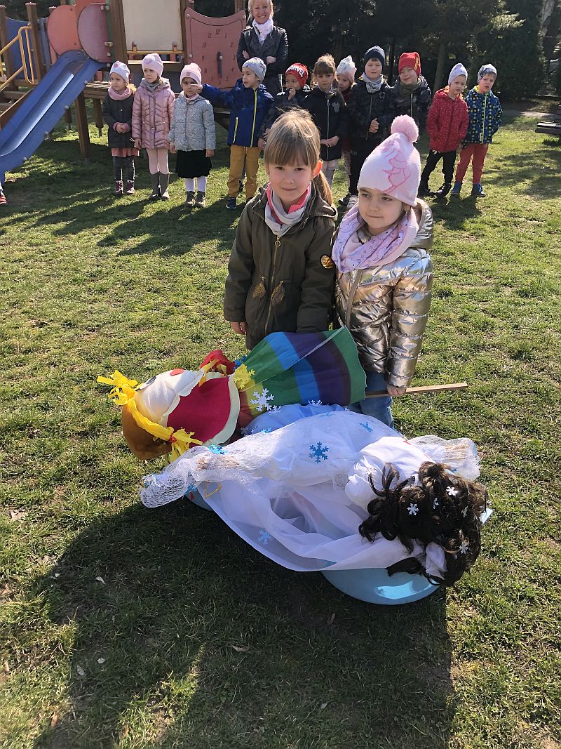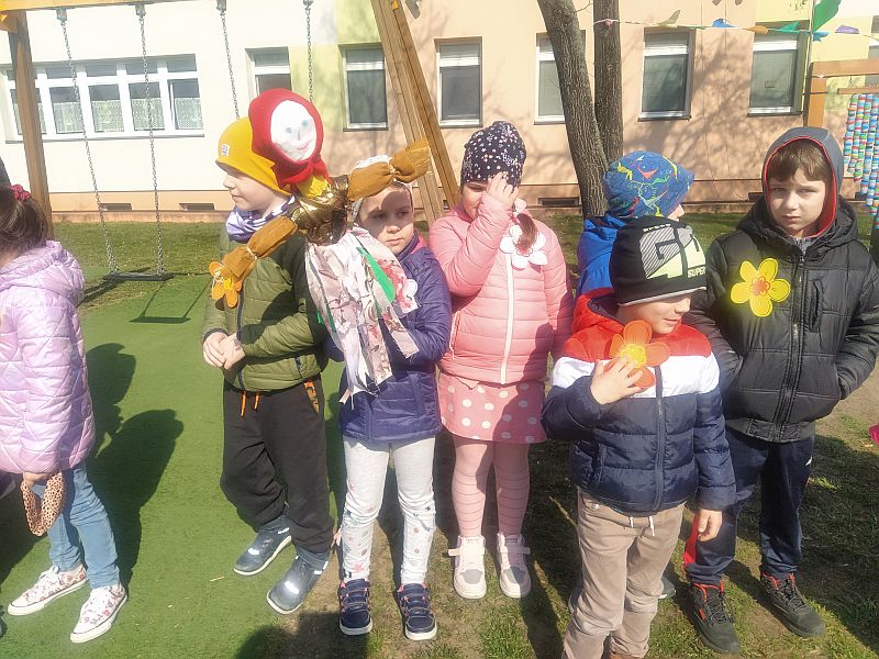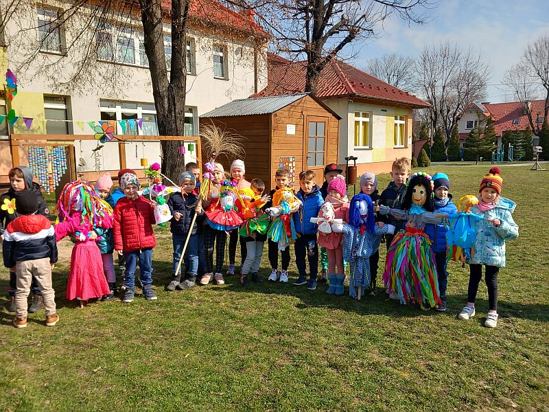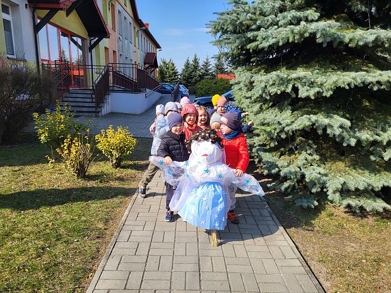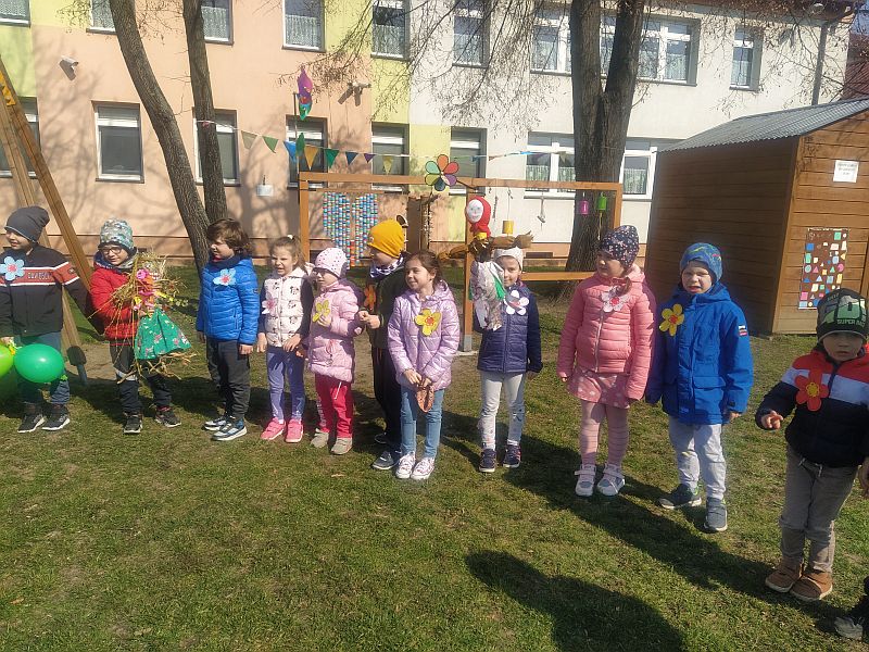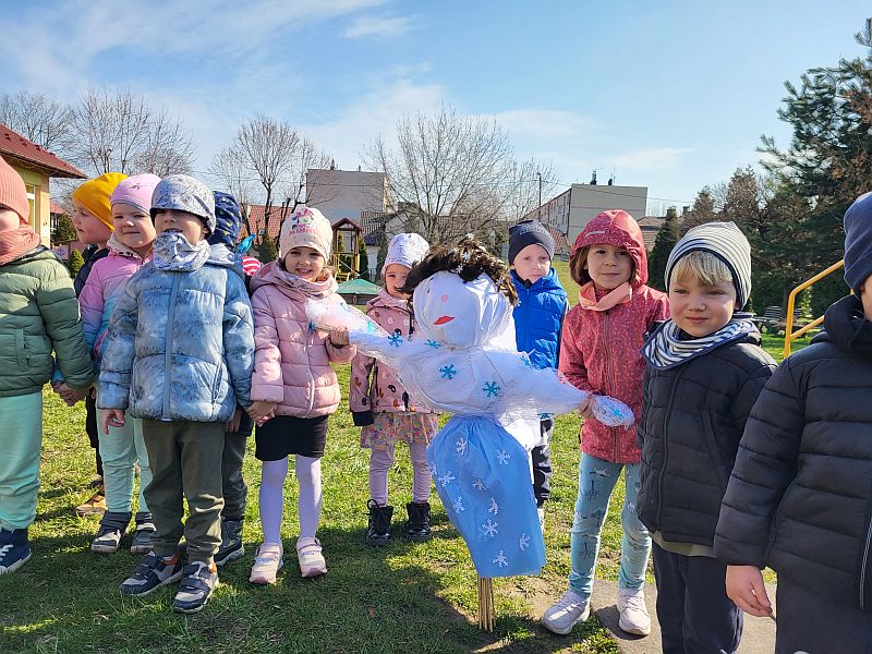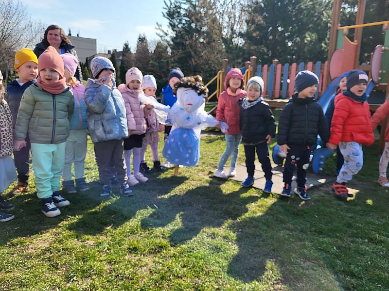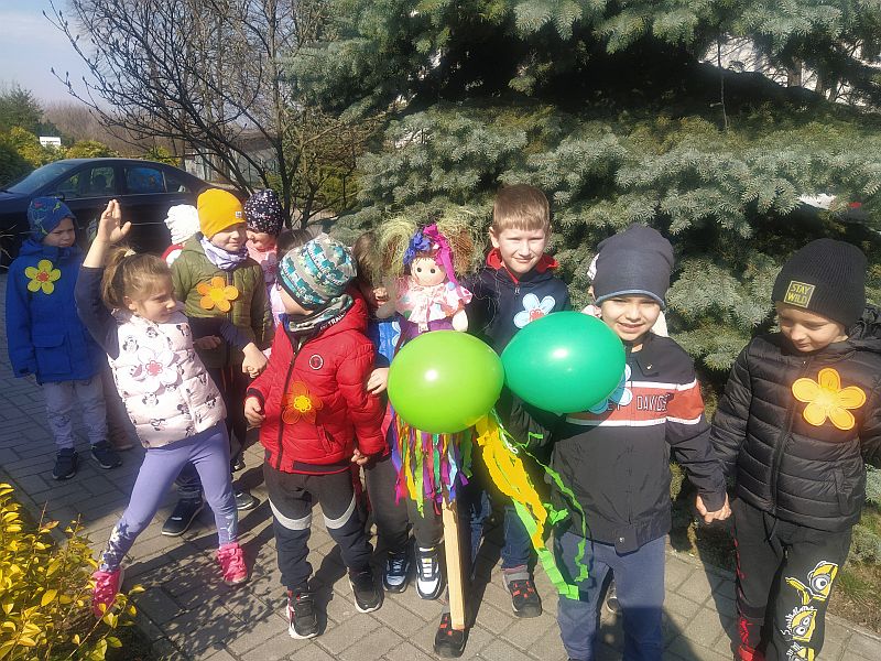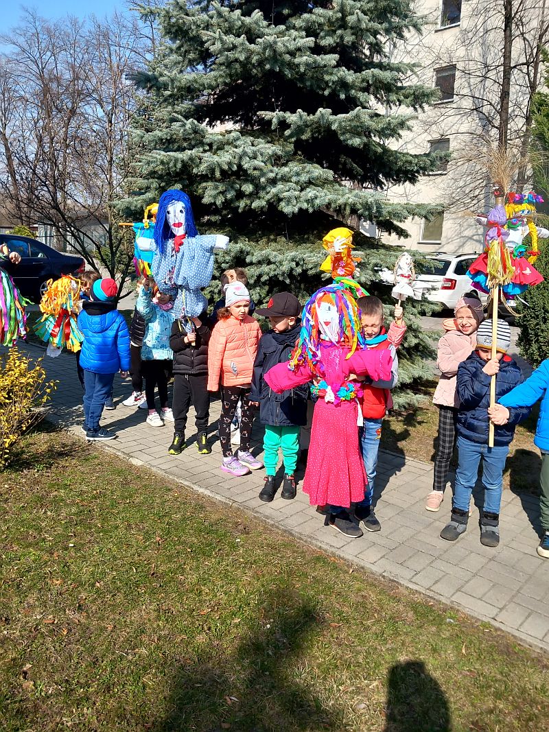 Pierwszego dnia Wiosny dzieci z naszego przedszkola z przygotowanymi Marzannami żegnały panią Zimę. Wspólny śpiew wiosennych piosenek sprawiał ,że promienie słońca zrobiły się cieplejsze , w naszych serduszkach zagościła radość ,a na twarzach promienny uśmiech.