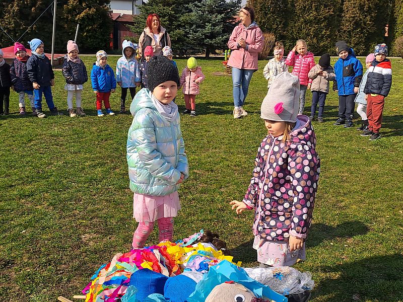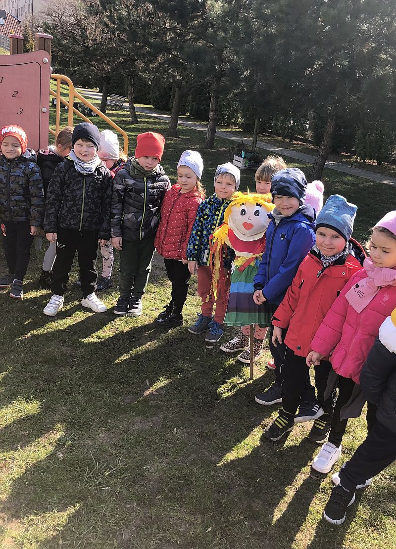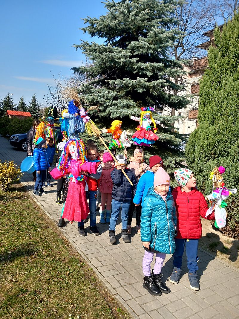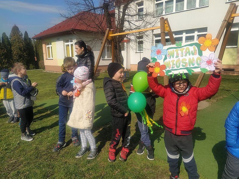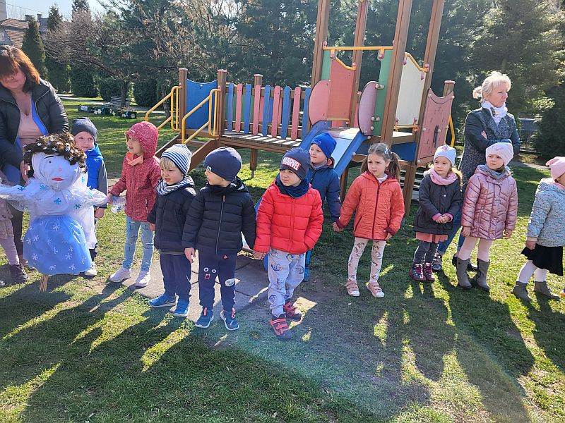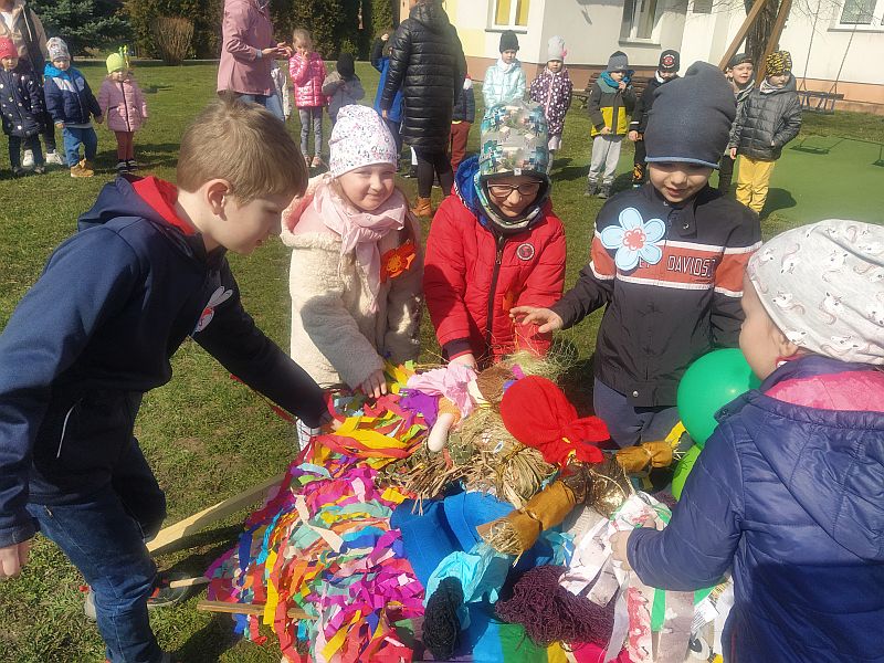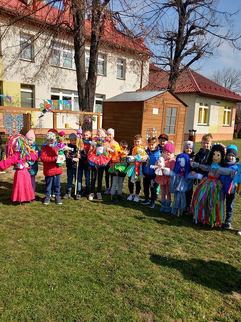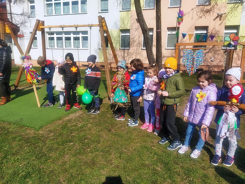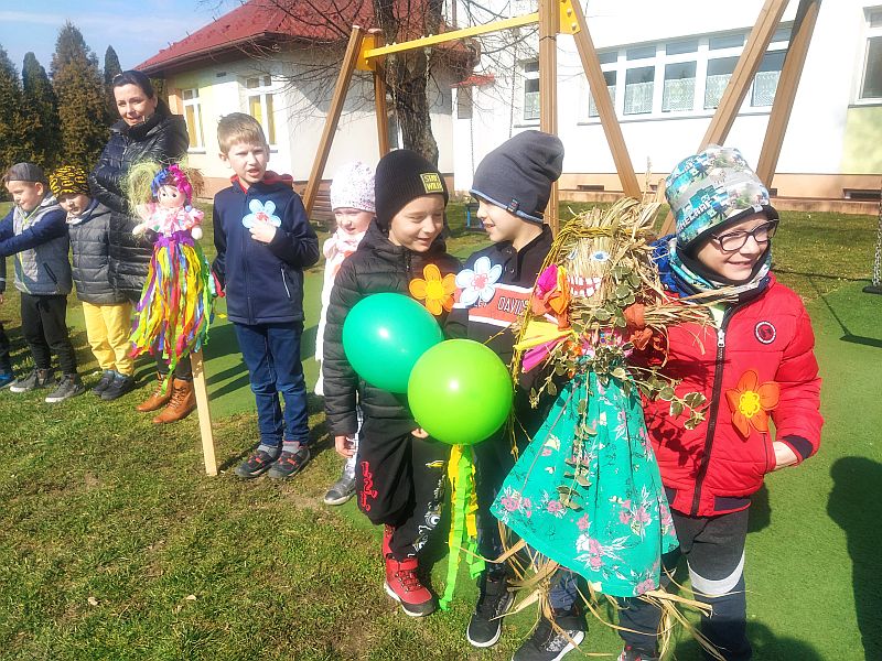 Pierwszego dnia Wiosny dzieci z naszego przedszkola z przygotowanymi Marzannami żegnały panią Zimę. Wspólny śpiew wiosennych piosenek sprawiał ,że promienie słońca zrobiły się cieplejsze , w naszych serduszkach zagościła radość ,a na twarzach promienny uśmiech.