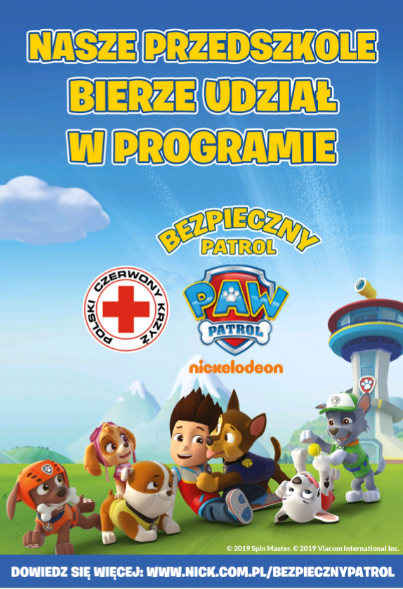 3 i 4 latki z naszego przedszkola biorą udział w programie BEZPIECZNY PATROL, który został przygotowany wspólnie z Polskim Czerwonym Krzyżem. Ma on na celu promocję zasad bezpieczeństwa wśród dzieci. Program zawiera sześć tematów: wiedza na temat bezpieczeństwa (numery alarmowe), bezpieczeństwo na drodze, bezpieczeństwo podczas uprawiania sportu, bezpieczeństwo podczas wakacji, bezpieczeństwo w zimie, ekologia i recykling. Przedszkolaki przyswajają informacje dotyczące bezpiecznych zachowań ćwicząc i bawiąc się razem z bohaterami bajki "Psi Patrol".