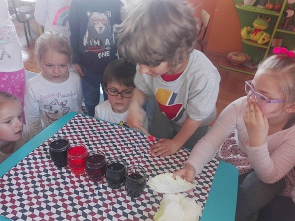 Czy woda gra? Przedszkolaki z grupy IV przeprowadzały eksperymenty z wodą. Na początku dzieci zabarwiły wodę na różne kolory po czym bawiły się wesoło w zabawę kolorowe dźwięki wody. Każdy miał szansę odtworzyć własną, wymyśloną melodię. Dowiedziały się pewnej ciekawostki-kiedy wlejemy więcej wody do szklanki, ta będzie miała niższy dźwięk, a kiedy wlejemy mniej wody, dźwięk będzie wyższy. Na zakończenie do wody z barwnikiem w każdej ze szklanek umieściliśmy jednego liścia kapusty pekińskiej. Ze zniecierpliwieniem wyczekiwaliśmy jaki będzie efekt... Już po kilku minutach widać było jak liście zaczynają przybierać kolorowe barwy. Dzieci były zachwycone i zdecydowanie mogły stwierdzić, że roślinki tak jak człowiek potrzebują wody do picia.