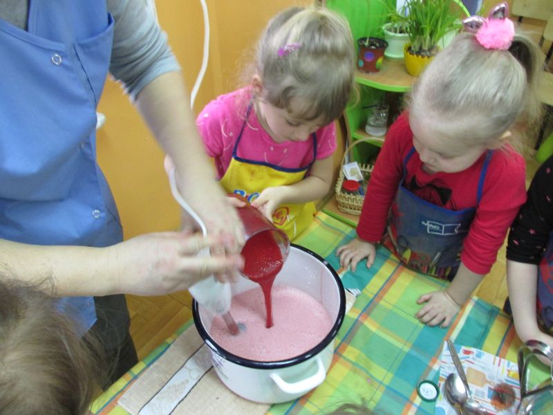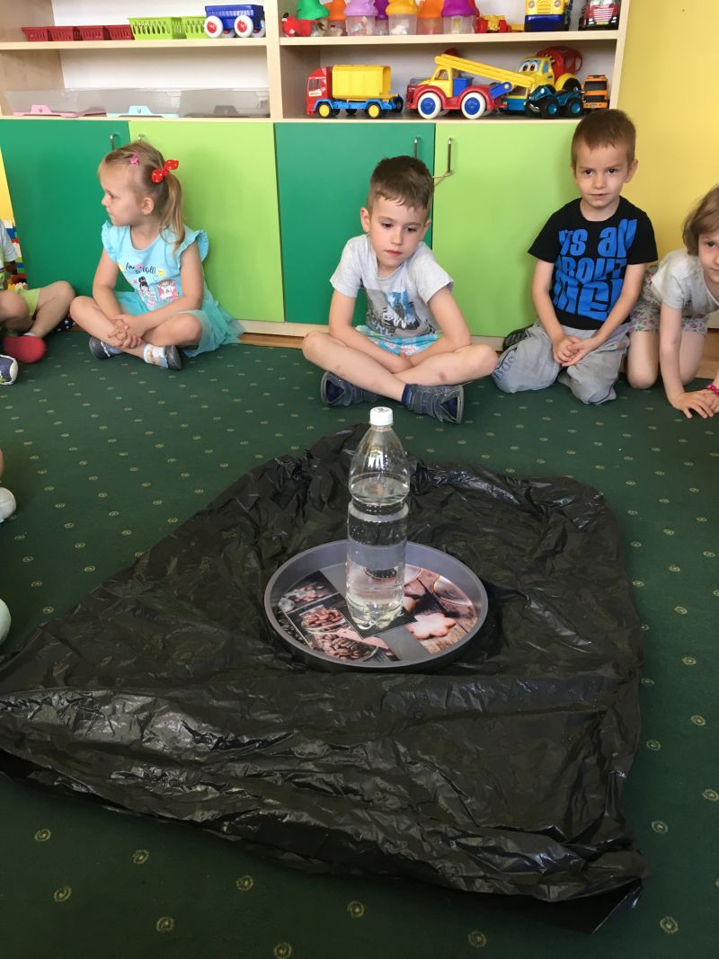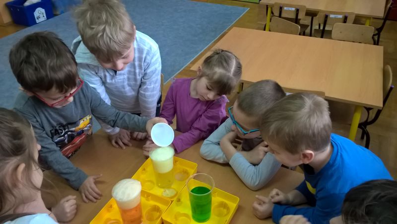 Lubimy eksperymentować. W grupie „Smerfów” zorganizowaliśmy „małe laboratorium”. Prowadziliśmy proste doświadczenia obserwując ich poszczególne etapy i efekty. Wykonaliśmy m.in. ciecz nienewtonowską -która wzbudziła duże zainteresowanie- kolorowe gejzery, poznaliśmy sposoby wędrowania cieczy, itp.