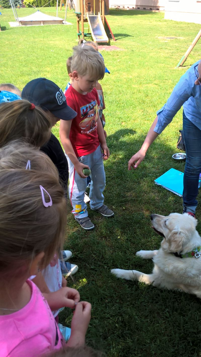 Dnia 8.05.2018r. przedszkolaków odwiedził specjalny gość pies Sorgo wraz ze swoim opiekunem. W czasie spotkania dzieci miały okazję dowiedzieć się jaką rolę odgrywa pies w społeczeństwie. Uczyły się jak bezpiecznie i odpowiedzialnie postępować z psem .Dzieci miały okazję przełamać lęk przed czworonogami i pogłębić kontakt przez podejście do psa i pogłaskanie. Bezpośredni kontakt ze zwierzętami przełamuje lęk, nieśmiałość , buduje poczucie bezpieczeństwa . Zajęcia te dostarczyły dzieciom wiele pozytywnej energii. Bardzo miło będziemy wspominać to spotkanie.